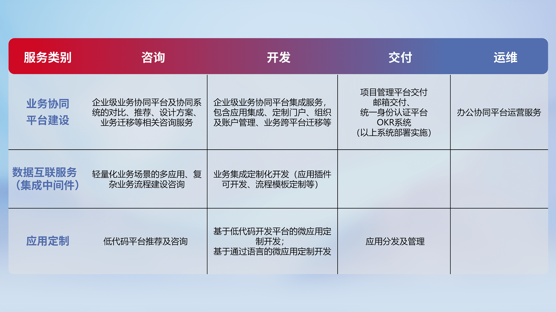 针对钉钉、、企微、、、IDaas等平台级产品提供产品的规划、、、方案、、交付、、、、定制化开发等服务,,,,实现如统一协同办公、、智能客户服务、、混合会议管理、、、智能数据查询、、等业务场景,,,,实现数字化转型。。。。